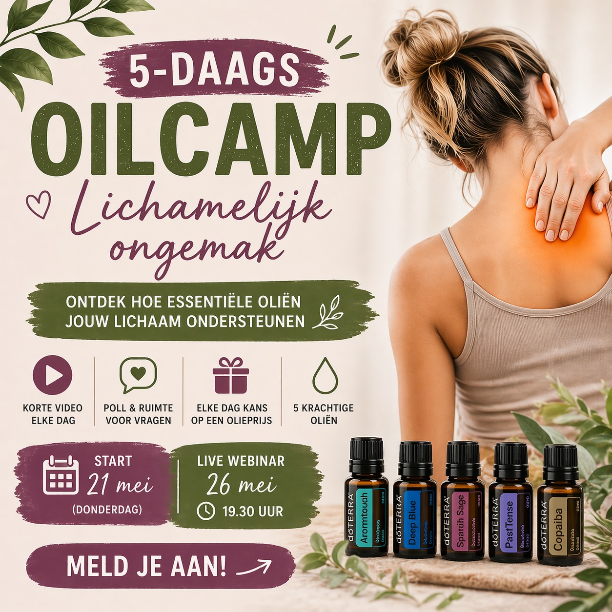 Tijdens dit 5-daagse Oilcamp ontdek je hoe je essentiële oliën kunt inzetten ter ondersteuning bij lichamelijke ongemakken. Denk hierbij aan […]