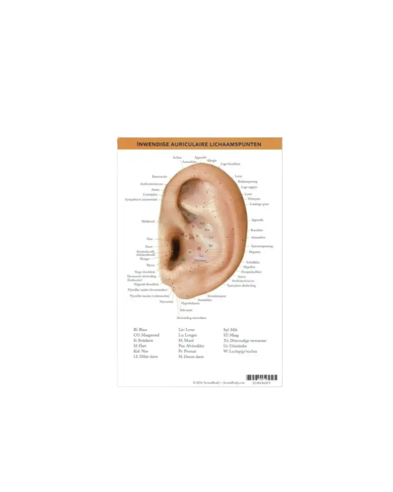 Deze auriculaire lichaamspuntenkaart toont overzichtelijk de inwendige reflexpunten op het oor. De kaart is een handig hulpmiddel om snel de juiste oorpunten terug te vinden en te gebruiken als ondersteuning bij ontspanning en welzijn. Geschikt voor zowel beginners als ervaren gebruikers, thuis of in een professionele setting.